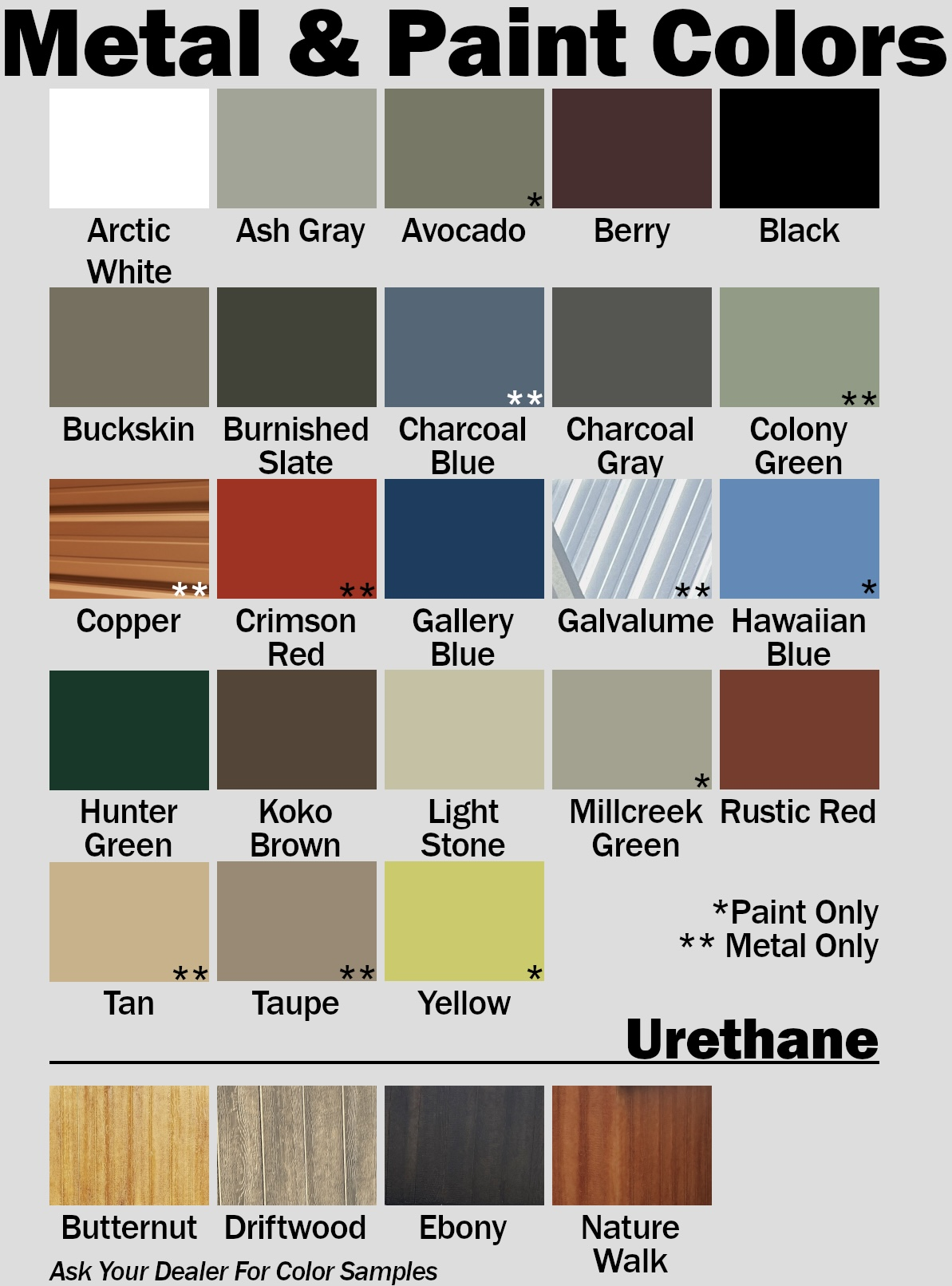 Whether it's the roof you are concerned about or the exterior walls, choose from our hand selected quality set of colors. Check with your local dealer for color samples.
